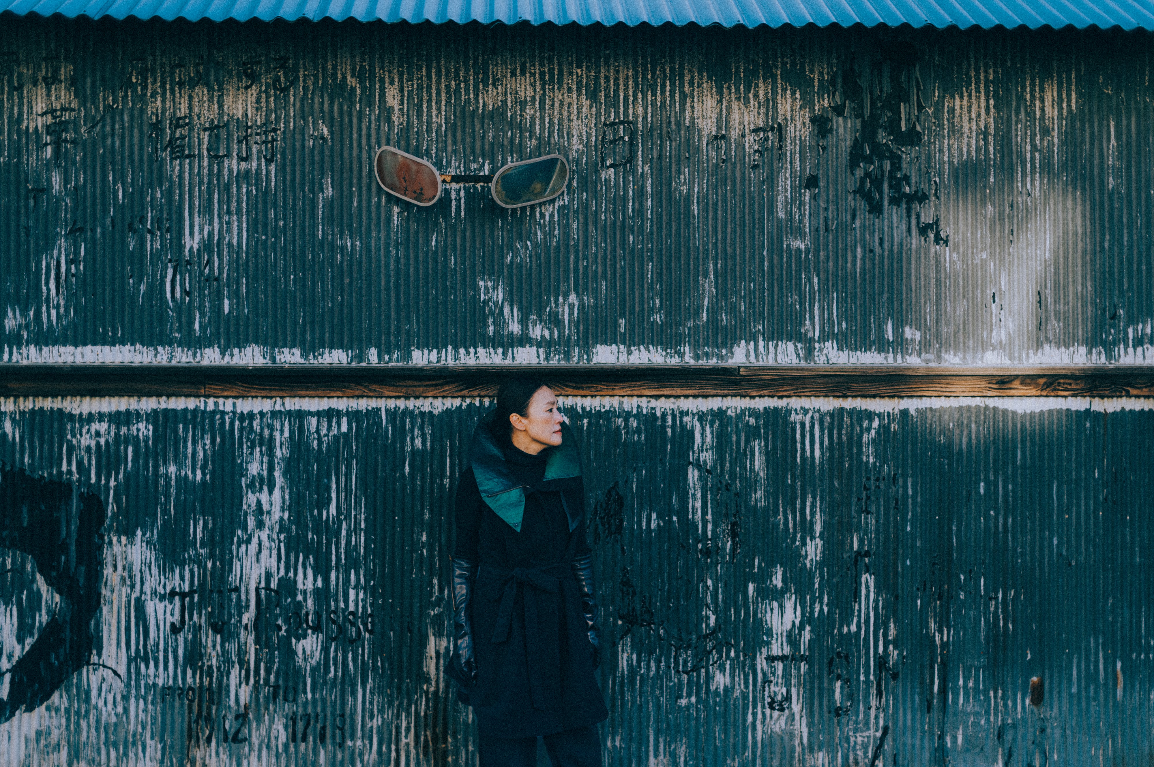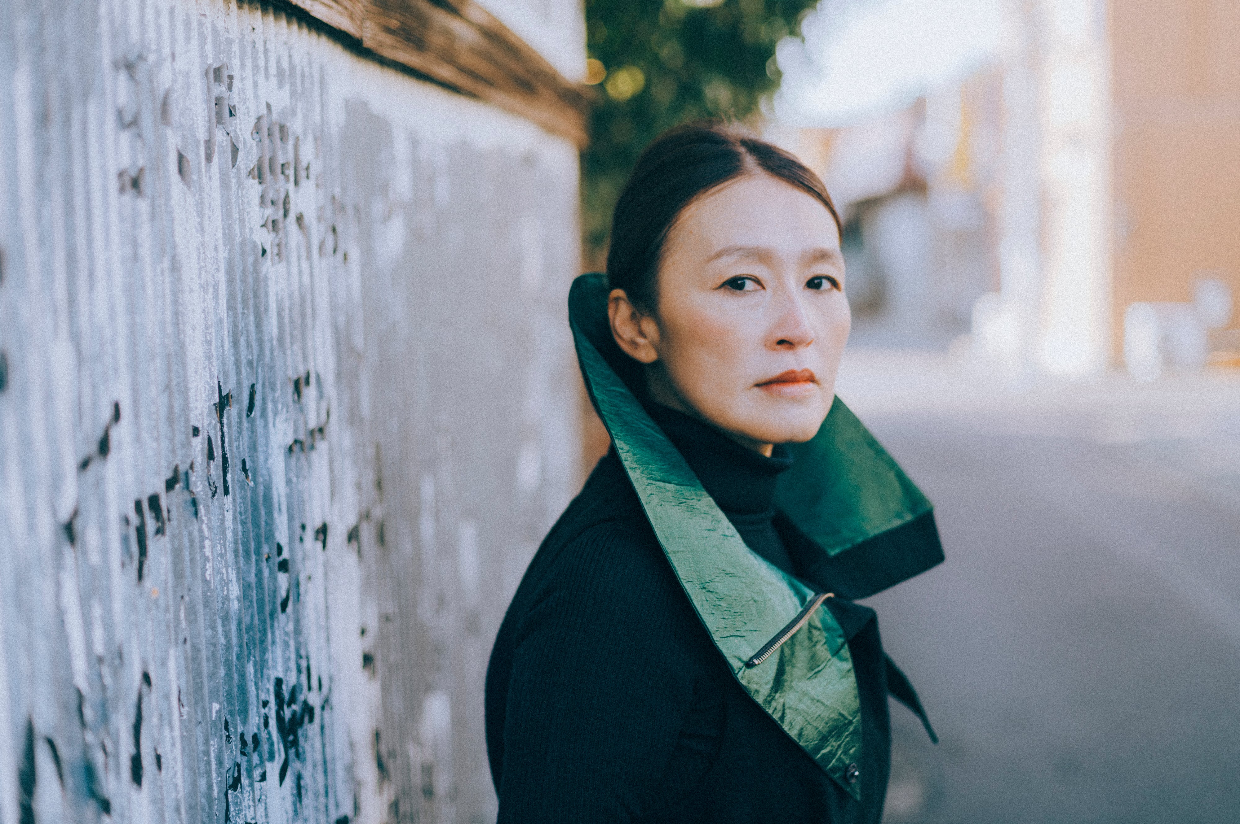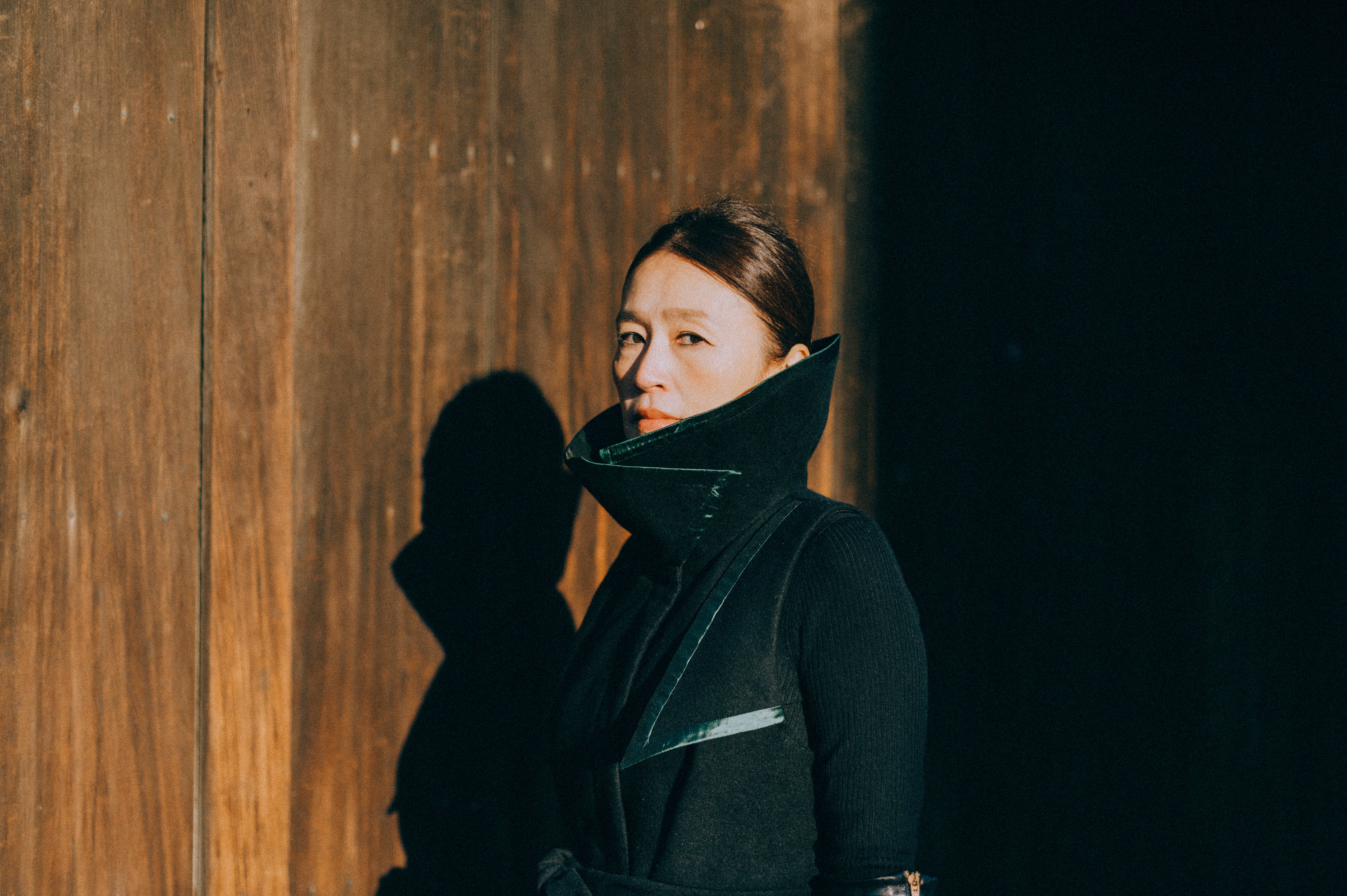 — 印象的な大きく広がった衿で、存在感を演出している。
